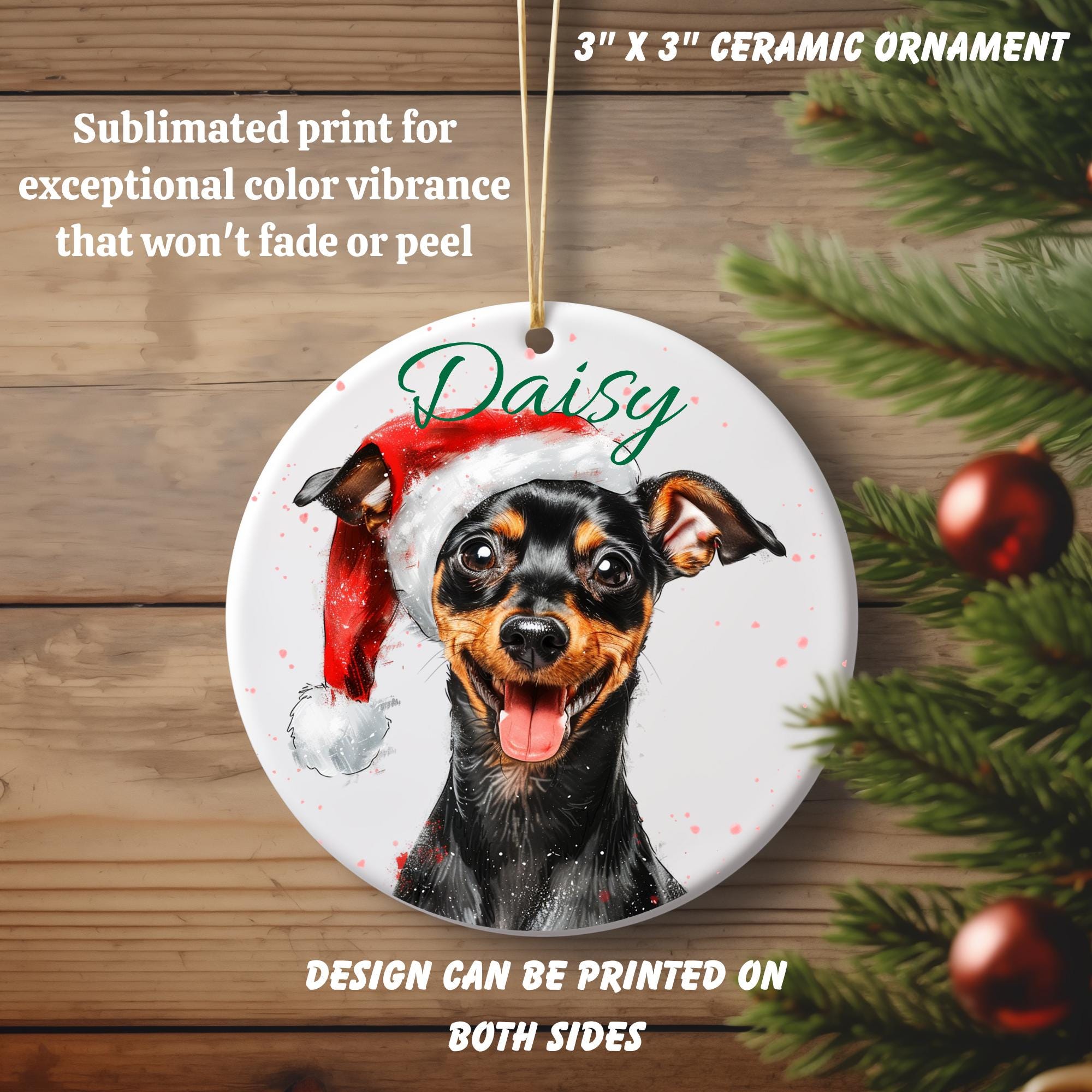 Design Adorable dog in Santa hat with custom name. Design can be printed on one or both sides.