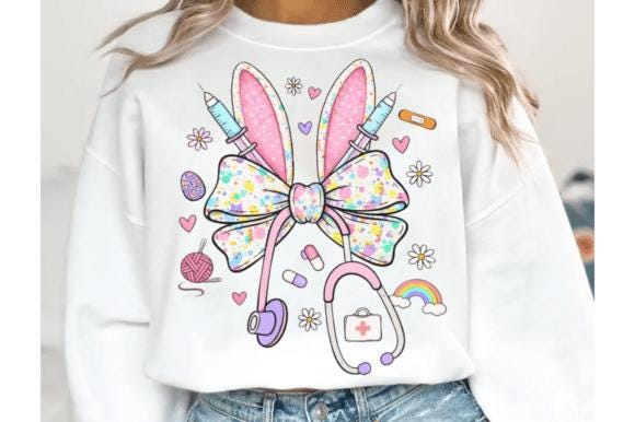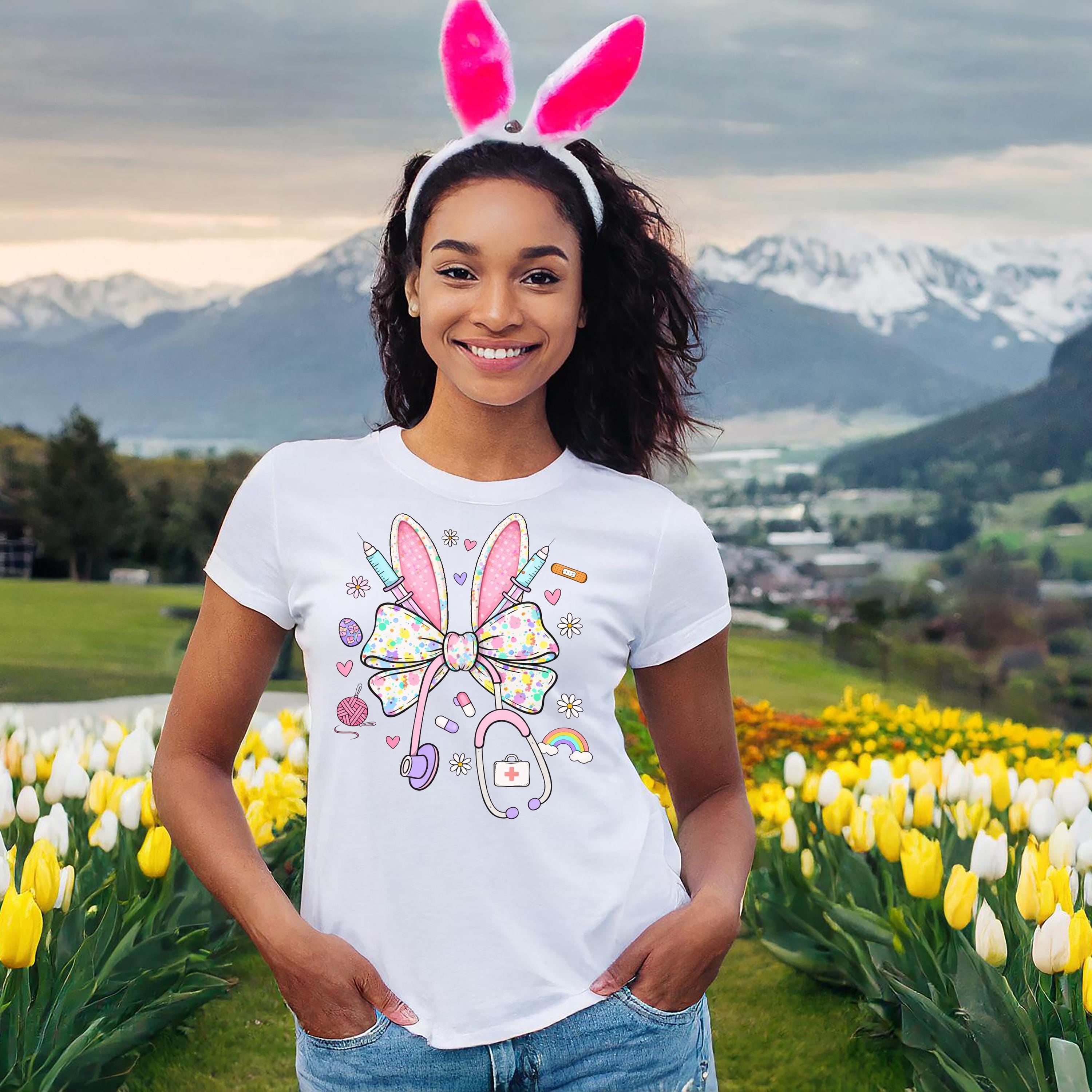 Designed with pastel bunny ears, a playful bow, stethoscope, and adorable medical icons, this shirt blends nurse pride with a soft coquette aesthetic—perfect for Easter and spring.